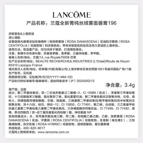 兰蔻196口红,作为一款经典朱砂橘色的唇膏,凭借其绝美显白的效果和丝滑的布朗尼质地,深受广大女性的喜爱。它的全新菁纯丝绒雾面质地,更是让这款产品在众多口红中脱颖而出。